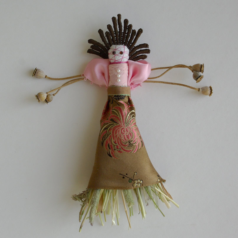 Poppy pod arms, vintage braid hair, timothy grass underskirt, Chinese brocade, satin ribbon & lace, rhinestones and "pearls".