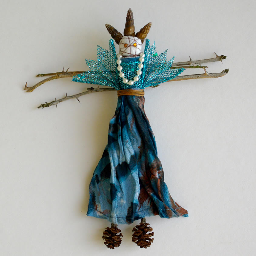 Blackberry twig arms, seashell headdress, Port Orford cedar cone feet, corded sash, glittered ribbon, "pearls" & rhinestones.