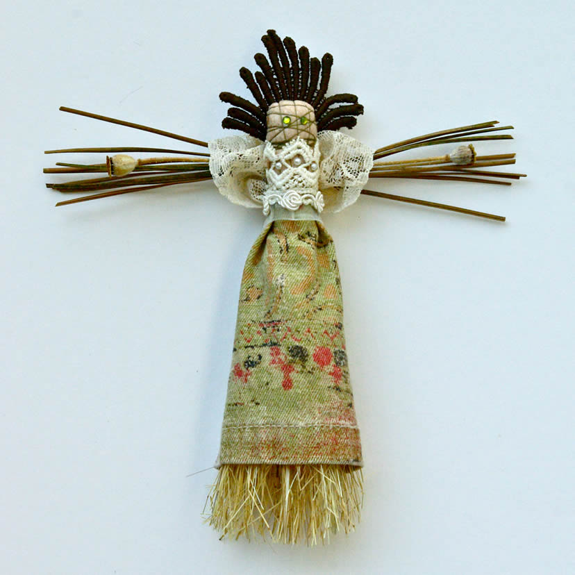 Pine needles, lace, pearls, straw, denim, poppy pods, wood, dyed fabric from coffee & black tea, rhinestones.