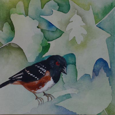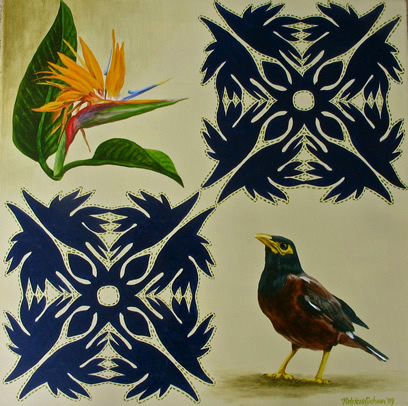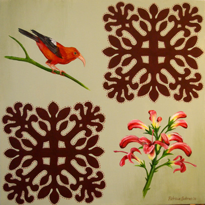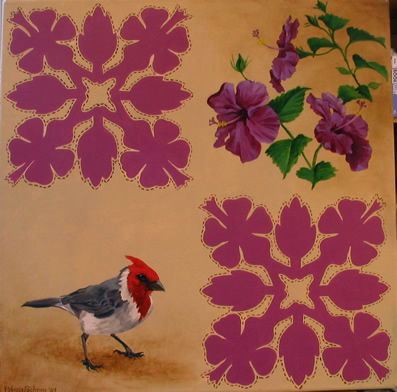 The long grey winters of Oregon often makes one long for warm beaches and tropical breezes! Hawaii is a magical place glorious colors and experiences. During a visit to the botonical gardens of Kauai, Pat was inspired by lovely antique Hawaiian quilts of floral designs. Upon her return to the mainland, she began a series of paintings that combined quilt patterns with their floral counterparts. She learned how to cut the traditional "snowflake" quilt blocks, each one replicating the flower it represented. Favorite birds of the islands frequent each painting.